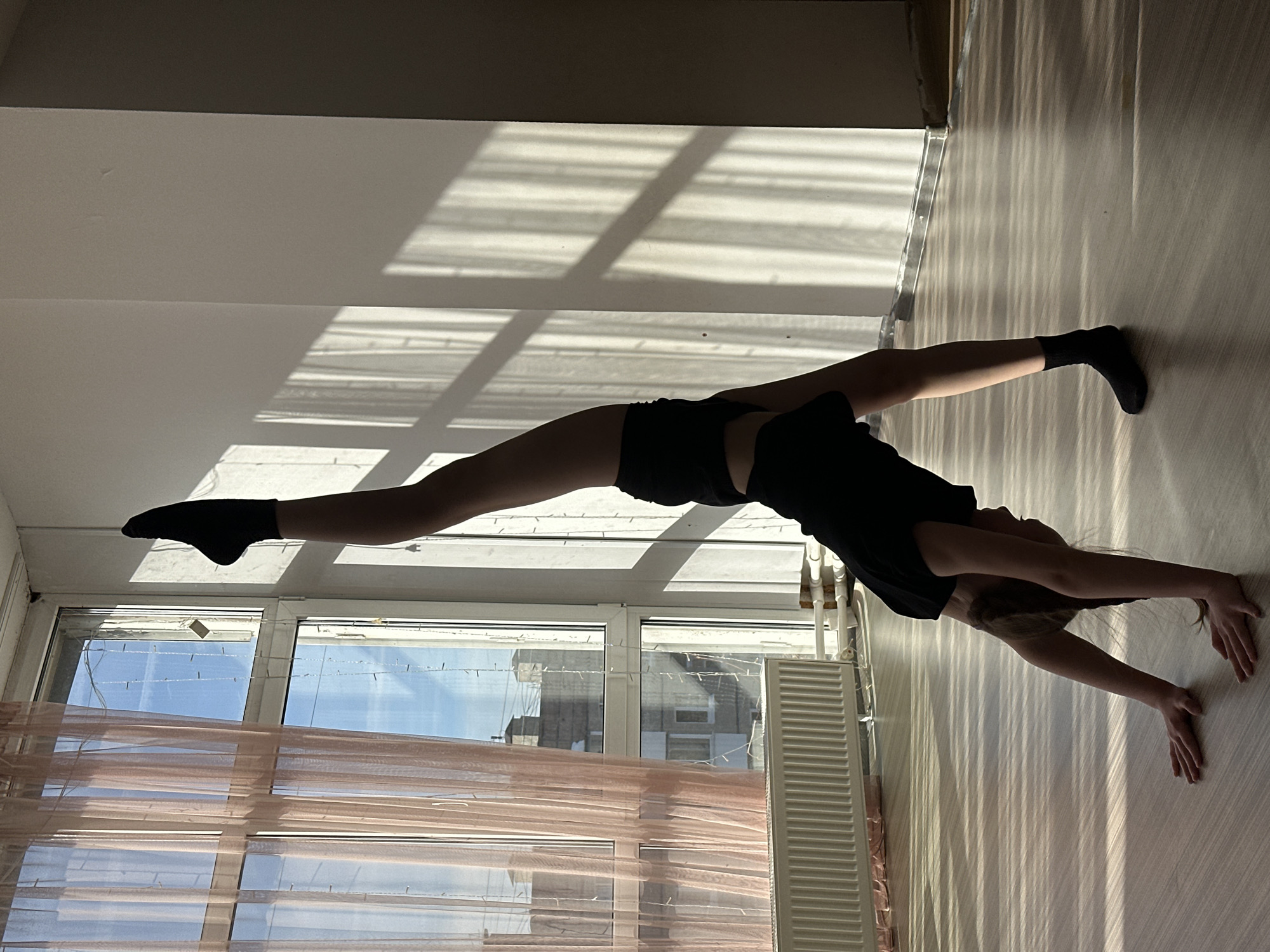 An indoor scene in what appears to be a studio or practice room in Votkinsk, Russia, is depicted. A young individual, likely female, with braided hair, is performing an acrobatic pose on a light-colored wooden floor, supporting themselves on both hands and one foot, with the other leg extended vertically upwards. They are dressed in a black short-sleeved top, black shorts, and black socks. Strong natural light from a large, multi-pane window on the left casts distinct rectangular shadows on a light-colored wall to the right and striped shadows across the floor. The window is adorned with translucent, peach-colored sheer curtains on its left side and vertical strings of small, white lights across the panes. A white panel radiator is installed beneath the lower left section of the window, connected by white pipes. Through the window, a clear blue sky with a faint contrail is visible. Several multi-story urban buildings, consistent with residential or commercial structures of concrete or stucco construction and flat roofs, are seen in the background, confirming an urban setting in Votkinsk, Russia. One building displays visible rooftop infrastructure.