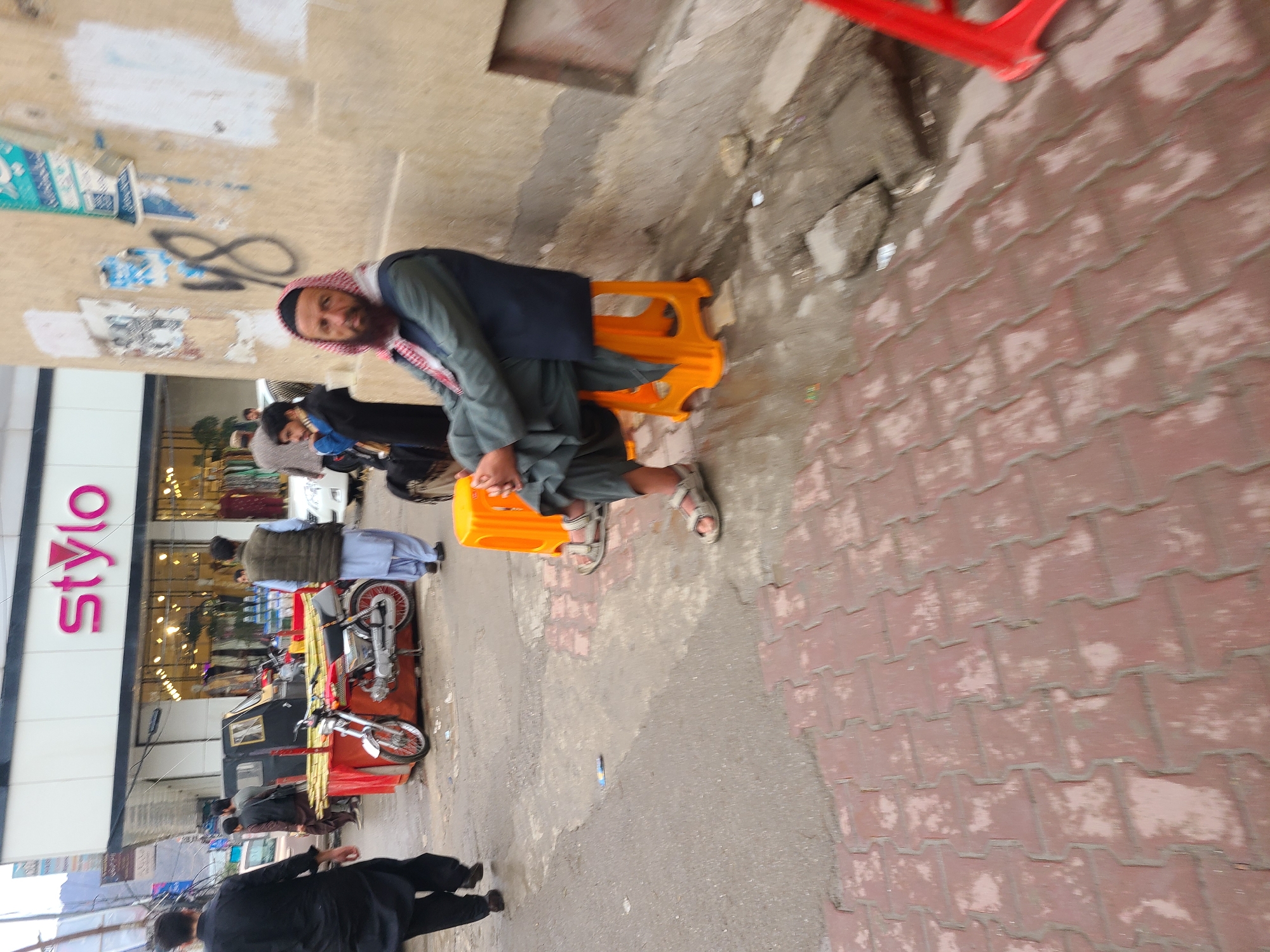 A man in traditional attire, including a headscarf, is seated on an orange plastic chair on a street. He is positioned near a building with "Stylo" signage. In the background, there is street activity, including people and motorcycles. The street is paved with red bricks, and the location is Quetta City Tehsil, Pakistan.