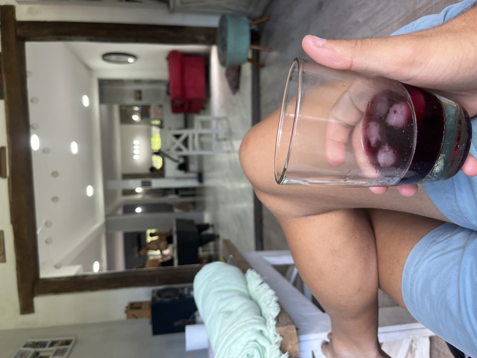 The image features a person holding a glass of dark-colored liquid with ice cubes. The person is seated, wearing a light blue garment. In the blurred background, a glimpse into the interior of a home is visible, including furniture, lighting fixtures, and an open floor plan. The perspective is slightly tilted, drawing focus to the foreground objects and the room's depth.