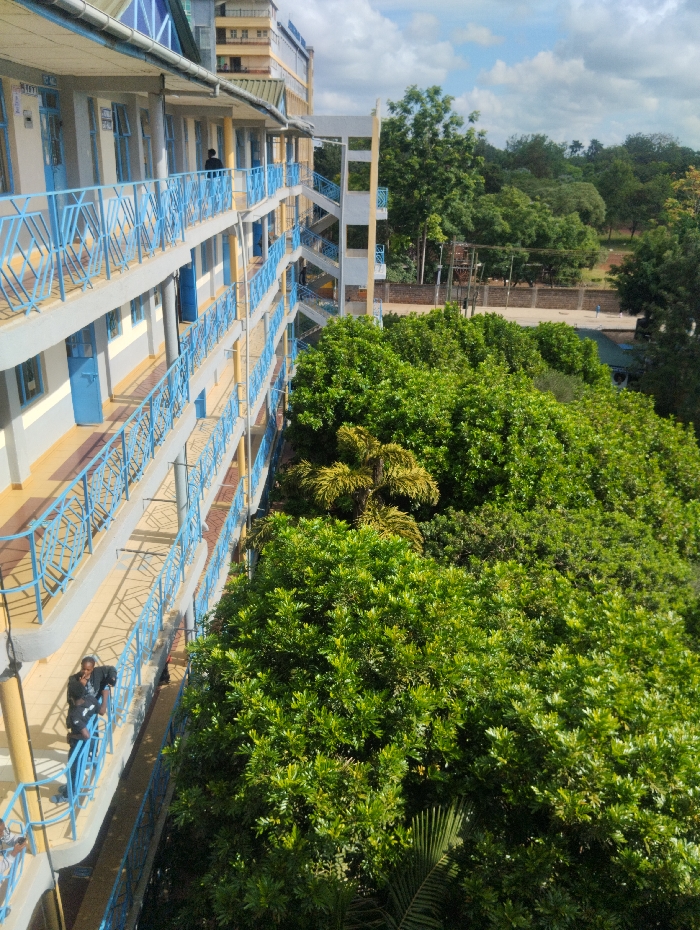 The image displays a multi-story building located within a hospital ward in Kenya, viewed from an elevated perspective