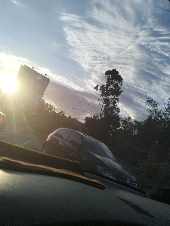 A car's dashboard fills the lower frame. Another vehicle, possibly a hatchback, sits ahead in traffic. A roadside billboard is backlit by the sun, obscuring its content. Overhead, scattered clouds streak across a blue sky. Trees and vegetation line the roadside. Power lines are visible against the sky. The scene is bathed in sunlight.