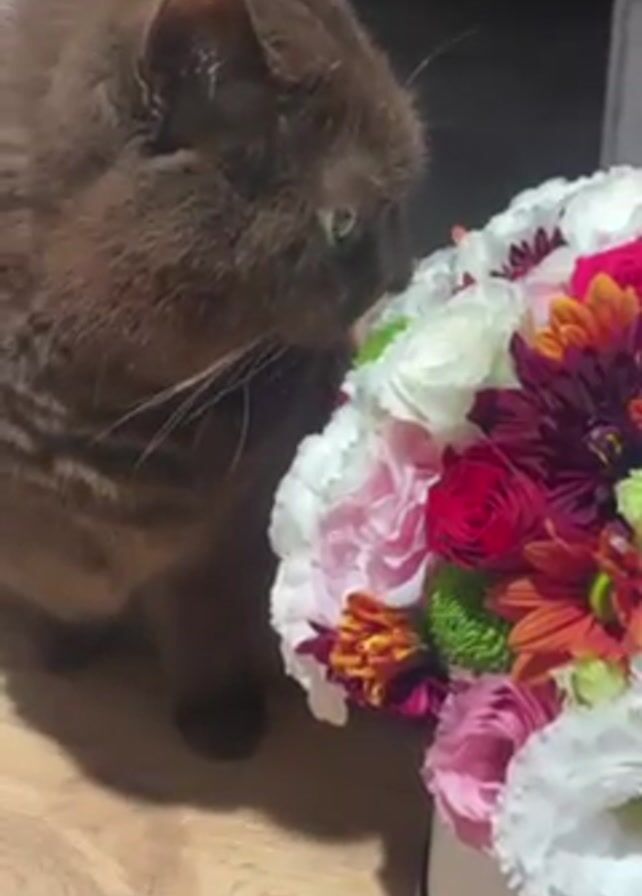 A brown cat investigates a colorful flower arrangement in a round white container. The cat sniffs the flowers, focusing its attention on the bouquet. The scene is illuminated by sunlight, casting shadows on the wooden surface where the flowers are placed.