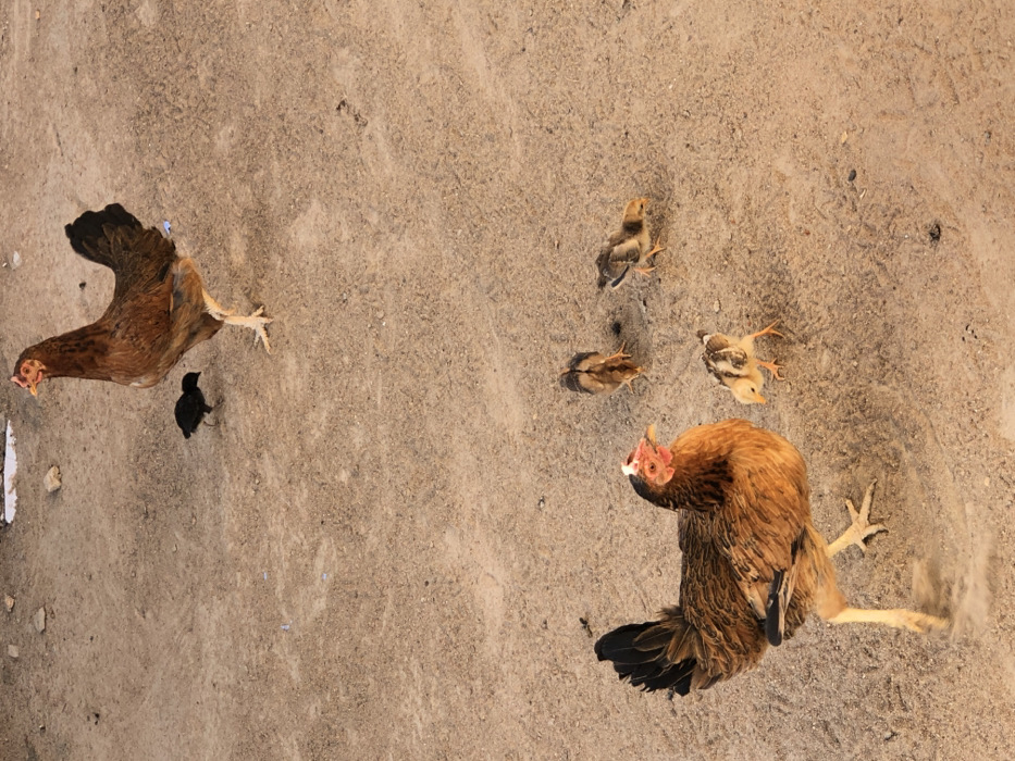The image depicts an unpaved outdoor area in Sabon Gari Nassarawa, Nigeria, characterized by dry, light brown soil with scattered minor debris. Six domestic fowl are present. In the upper right quadrant, one adult brown hen stands erect, facing towards the left. A small, uniformly black chick is positioned directly to the left of this hen. In the lower left quadrant, a second adult brown hen, visually similar to the first, stands with its left leg elevated, looking downwards and slightly to the right. Four chicks are clustered around this second hen: one predominantly yellow and dark-marked chick is immediately to its right, while three other chicks, displaying dark brown and lighter markings, are situated to its right and rear, engaged in apparent foraging activity. The scene is illuminated by natural daylight.