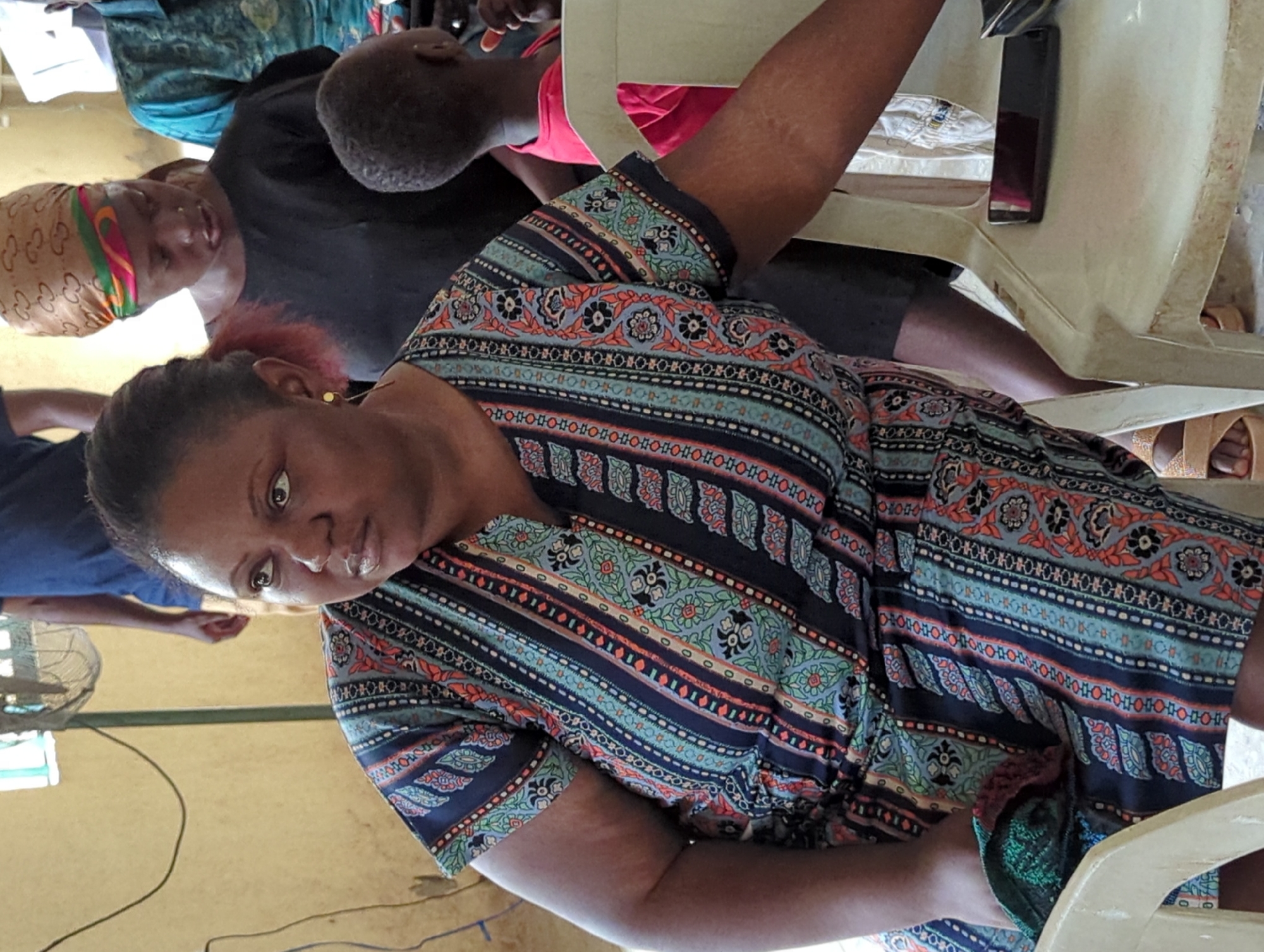 The scene depicts an interior room, location unknown, within the city of Unknown, Unknown. An adult female with dark skin and dark hair, pulled back with visible reddish-brown highlights, is seated centrally on a light-colored plastic chair. She wears a short-sleeved dress with vertical stripes and floral patterns in shades of blue, teal, orange, and black, and small gold-colored stud earrings. Her gaze is directed upwards and to her upper left, with a neutral expression. Stretch marks are visible on her arms. Behind and to her right, another adult female with dark skin is partially visible, wearing a brown patterned headwrap over a colorful striped headband and a black short-sleeved top; she looks downwards. Adjacent to her is a young child with dark skin and short hair, wearing a red short-sleeved top, seated on a similar plastic chair. In the background, a male torso in a blue t-shirt is visible to the far left. To the far right, a partial arm in a blue patterned shirt is also visible. On a light-colored plastic chair positioned to the right of the central female, a black smartphone with a reflective screen and a smaller dark object are present. The room features light-colored, likely beige or yellow, painted walls, with exposed black and blue electrical cables running across them. A partially obscured wall-mounted or stand fan with a metal cage is visible in the upper left background.