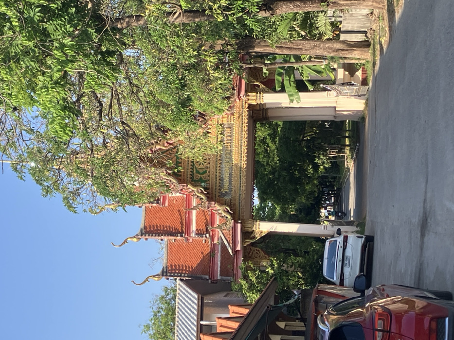 The image depicts the entrance to Wat Plai Laem, a Buddhist temple located in Choeng Mon, Koh Samui, Thailand, under a clear blue sky. A large, ornate temple gate, predominantly orange-red and gold with green and white accents, spans the central portion of the frame. The gate features a multi-tiered, tiled roof topped with traditional chofa finials. Golden ornamentation, including what appears to be a Dharma wheel symbol, adorns the frieze, which also bears Thai script reading "วัดปลายแหลม" (Wat Plai Laem). To the left of the gate, parts of an adjacent building with a similar orange-red tiled roof and a gray-roofed structure are visible. Lush green foliage and tree branches partially obscure the upper sections of the gate and buildings. In the immediate foreground on the left, the rear quarter of a red passenger vehicle is parked, facing away from the viewer. Behind it, a white sedan with a Thai license plate (ษค 4998) is parked facing the gate, partially obscured by the red vehicle. An asphalt road extends directly under the temple gate and recedes into the background, lined on both sides by dense green trees and vegetation. A single individual on a motorcycle is visible traveling down this road in the far distance, moving away from the gate. The right side of the frame features more trees, including banana plants, and a light-colored concrete wall running parallel to the road. The scene is illuminated by natural sunlight, casting shadows and highlighting the architectural details.