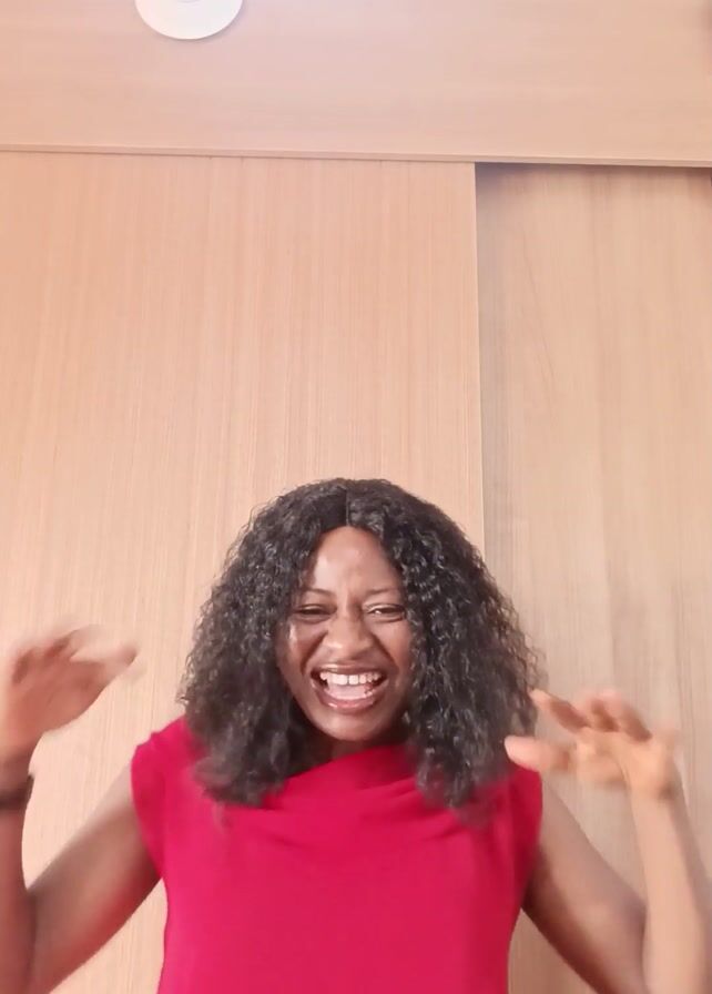 A woman in a red sleeveless top stands in front of a light brown closet door and laughs while moving her hands. She has dark, curly hair and is wearing a watch on her left wrist. There is a round light fixture on the ceiling above her. Loud music is playing in the background.