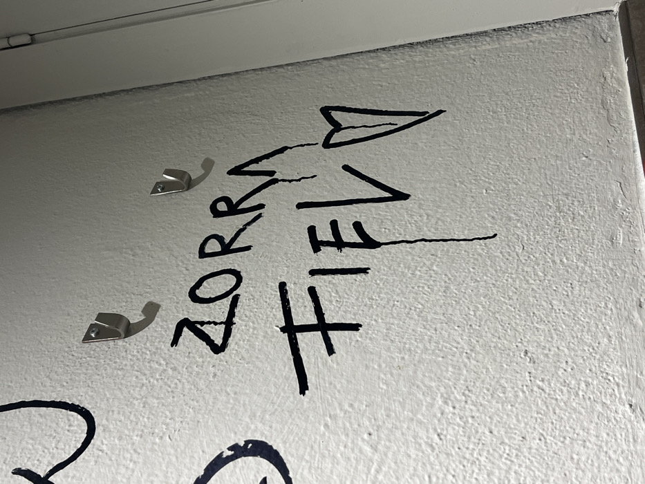 The image displays a close-up, low-angle view of a textured, off-white painted wall, likely an interior surface, under artificial lighting. On the right side, a white door frame or door edge is visible. Two silver-colored, metallic hooks are screwed into the wall, casting distinct shadows below and to their left. The wall features handwritten graffiti in black marker or paint. The primary graffiti consists of two lines of text: "ZORRA" is written in bold, uppercase letters with some dripping of the black ink, particularly from the letters 'R' and 'A'. Below it, "FIEL" is written in similar bold, uppercase letters, with a pronounced, elongated drip of ink extending vertically from the letter 'E'. To the right of "FIEL", a crudely drawn heart symbol is present. Partial black markings, possibly additional graffiti, are visible along the far left edge of the image. No people are depicted. The graffiti "ZORRA FIEL" is in the Spanish language. While this suggests a Spanish-speaking region, the specific location within the city of Barcelona, Spain, cannot be determined from the visual information provided in the image.