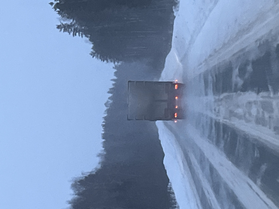 - "The image captures the rear view of a dark-colored semi-trailer truck driving on a snow and ice-covered two-lane road in Novyi, Russia" by FM-khv1N2, licensed under CC BY 4.0