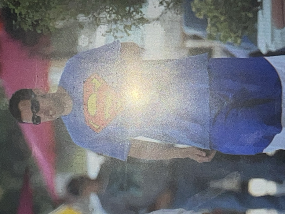 The image depicts actor Adam Sandler in a public outdoor area of Boston, United States. Sandler is observed walking or standing, facing generally forward and slightly to the right of the frame. He is wearing a light blue, short-sleeved t-shirt featuring a prominent red and yellow Superman shield logo on the chest. He has dark-rimmed sunglasses on, dark hair, and appears to have facial hair. Below the t-shirt, he wears dark blue athletic-style shorts, with a visible white layer or undershirt extending beneath them. Behind Sandler, to his left, a blurred male figure is partially visible, wearing a dark t-shirt and dark pants. The background is out of focus, showing a reddish-pink overhead structure, possibly an awning or tent, in the upper-left, and green foliage, consistent with shrubs or plants, on the right side. A light-colored planter or barrier is partially visible on the lower right. A significant bright light anomaly or glare is present in the central lower portion of the image, obscuring some detail on Sandler's lower torso.