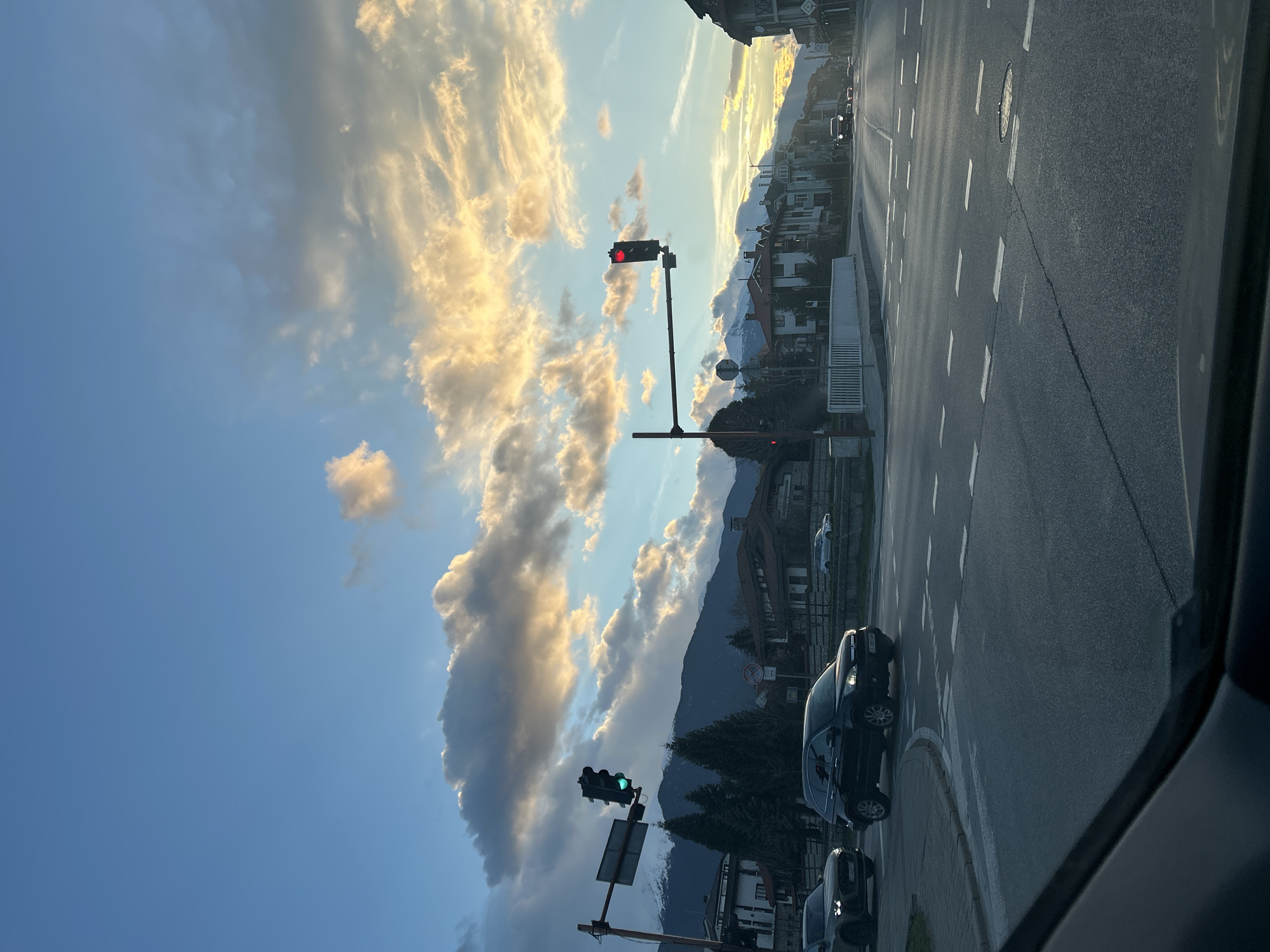 The photograph captures a street scene in Bansko, Bulgaria. A multi-lane asphalt road with white lane markings runs through the frame. Several cars are visible on the road and parked along the side. The backdrop features buildings typical of a town, with mountains visible in the distance. The sky is partially cloudy with hues of blue and hints of golden light, likely indicating sunrise or sunset. Two sets of traffic lights are present, one showing a red light and the other a green light. The image appears to have been taken from inside a vehicle.