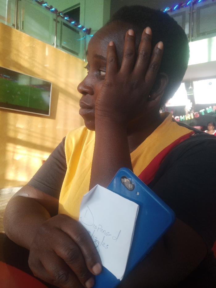 The image displays an adult female seated indoors at a commercial establishment in the city of Jos, Nigeria. She is depicted in a left-profile view, with dark skin and short dark hair. Her right hand is positioned with fingers splayed against her forehead and cheek, supporting her head. She wears a yellow top over a dark, long-sleeved garment that exhibits red and black stripes on the collar/shoulder area. Her left hand holds a blue smartphone, behind which a folded white piece of paper is tucked. The paper shows handwritten text including "Dispensed" and a date or numerical sequence, such as "8/13/25". The background features a golden-yellow wall with a wall-mounted flat-screen television displaying a soccer match on a green field. Above, decorative blue and red string lights are strung. To the right, a second, partially obscured television screen displays the word "CHRISTMAS", below which a blurry figure in red is faintly visible. A metallic railing with glass panels is present in the upper left background.