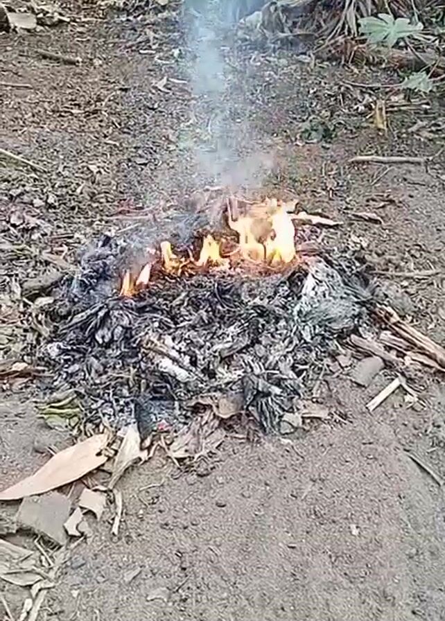 A small pile of debris is burning on the ground. The debris appears to consist of dead leaves, twigs, and other organic matter. The fire is producing flames and smoke. The surrounding area is covered in dirt and leaves.