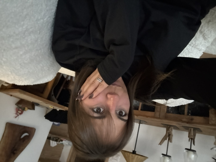 A woman with bangs poses upside down, resting her hand near her face. She wears a black sweatshirt. Behind her, a shelf is decorated with wooden art pieces, including lamps. A wooden piece with a hole sits to the left. She appears to be lying on a white, fluffy surface, possibly a blanket or couch. She has brown nails and a ring on her finger. Her eyes are brown.