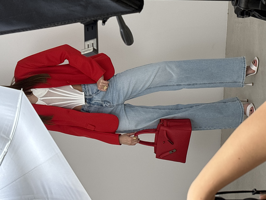 The scene is an indoor setting, identified as the city of Krasnodar, Russia. The environment consists of plain light-colored walls and a matching floor, indicative of a photographic studio. Studio equipment is visible, including a large white parabolic light diffuser in the upper left and a black light stand on the right. One female subject is centrally positioned, with her head cropped out of the frame. She wears a white structured corset-style top, an open red long-sleeved blazer, light blue wide-leg denim jeans, and white open-toed high-heeled sandals. In her left hand, she holds a bright red structured handbag with dual top handles and metallic accents. A gold-colored ring is present on her left ring finger, and another on her right middle finger. Her right hand rests on her hip. A blurred human arm is visible in the lower left foreground, suggesting the presence of another individual, likely operating a camera. The subject's pose and the visible equipment indicate a photoshoot in progress.