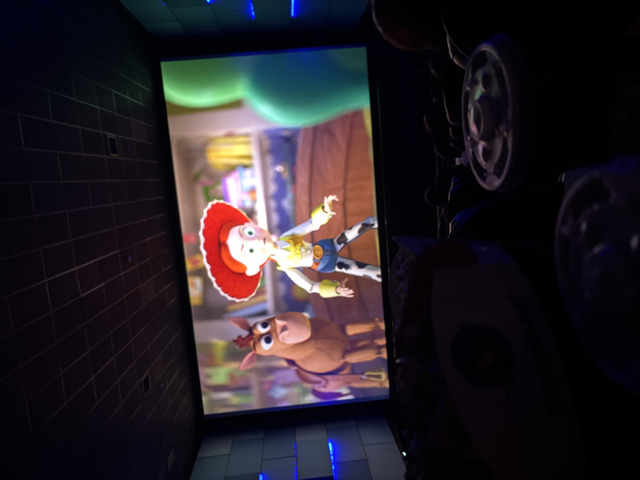 This image presents the interior of a darkened cinema hall, located in the city of San Juan de Miraflores, Peru, during the screening of an animated film. The central subject is a large projection screen displaying a scene from the Disney/Pixar *Toy Story* franchise. On the screen, two primary characters are visible: Jessie the Cowgirl and Bullseye the horse. Jessie stands prominently in the center-right of the screen, depicted with her characteristic red wide-brimmed hat, white shirt with yellow star badge, blue jeans with white and black cow-print chaps, and boots. Her expression appears alert or slightly concerned. To her left is Bullseye, the brown horse, looking forward. The background of the animated scene is a brightly lit child's room, featuring shelves filled with colorful objects and toys on the left. A large, blurry, light-green object or character is partially visible on the far right edge of the screen. The cinema environment is dark, with a ceiling composed of dark, rectangular grid-patterned panels, likely for acoustic dampening. The side walls feature horizontal strips of recessed blue LED lighting that cast a subtle glow on what appear to be tiled or paneled surfaces. The perspective is from an audience member's seat. The dark, indistinct silhouettes of several other viewers' heads are visible across the lower middle and right foreground, suggesting occupied rows of seating. In the immediate foreground, to the left, a portion of a light-colored, branded container, potentially a popcorn tub, is visible. To the right, a dark beverage cup with a clear plastic lid is resting on a surface, likely a cup holder within the cinema seat. The primary illumination within the hall emanates from the projected film itself. No direct actions or interactions are discernible among the audience members or foreground objects, other than the implied act of watching the film.