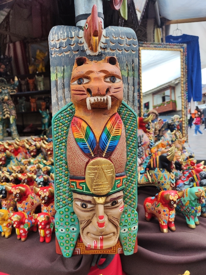 A brightly colored wooden totem pole, featuring a bird at the top, a tiger head in the middle with vibrant feather details, and a face at the bottom, stands amidst a display of various handcrafted goods