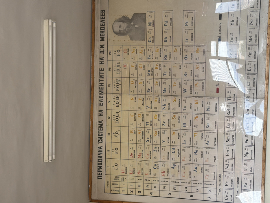 The image depicts an interior room within Belogradchik, Bulgaria, characteristic of an educational or institutional facility. A white fluorescent light fixture, housing two tubular bulbs, is mounted on a light-grey ceiling in the upper frame. Below this, a large, aged wall-mounted chart of the Periodic System of Elements, titled "ПЕРИОДИЧНА СИСТЕМА НА ЕЛЕМЕНТИТЕ НА Д.И. МЕНДЕЛЕЕВ" (Periodic System of Elements of D.I. Mendeleev) in Bulgarian, dominates the lower two-thirds of the scene. The chart features elemental symbols, atomic numbers, names in Bulgarian, and atomic weights, including the Lanthanoid and Actinoid series. A black-and-white portrait of Dmitri Mendeleev, depicted with a beard, is integrated into the upper right portion of the chart. The chart exhibits discoloration, creasing, and significant reflections on its protective surface, with distinct horizontal striped patterns visible in the lower right quadrant. A thin, light-brown wooden border frames the chart. No individuals are present.