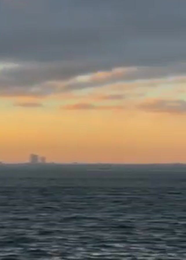 wide expanse of water under a cloudy sky, with an orange hue indicating a sunrise or sunset. In the distance, a cityscape can be discerned, possibly a coastal city, with visible structures that could be towers or minarets. The water is gently rippling, and some plant life is visible in the foreground, suggesting the shot is taken from a shoreline. The overall tone is serene and atmospheric.