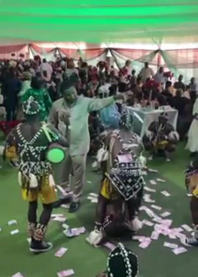 The scene appears to be at an event under a large white tent with green lighting. A crowd of people is gathered, mostly in the background. In the foreground, several performers wearing traditional tribal costumes with beaded decorations and drumming instruments are dancing. A man in a light-colored outfit is among them, directing or interacting with the dancers while throwing money on the floor. The floor is covered with scattered banknotes.