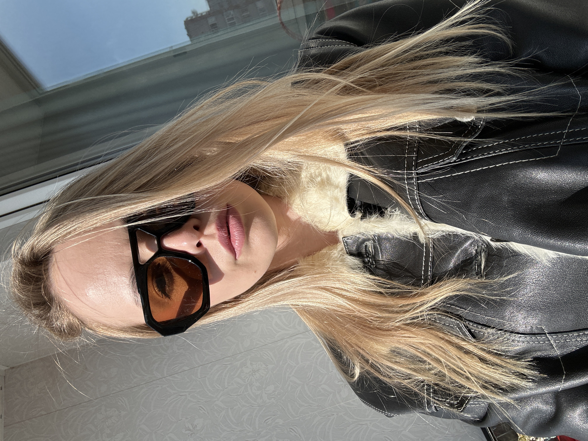 A young woman poses in front of a window wearing a black leather jacket with a white fur collar and sunglasses