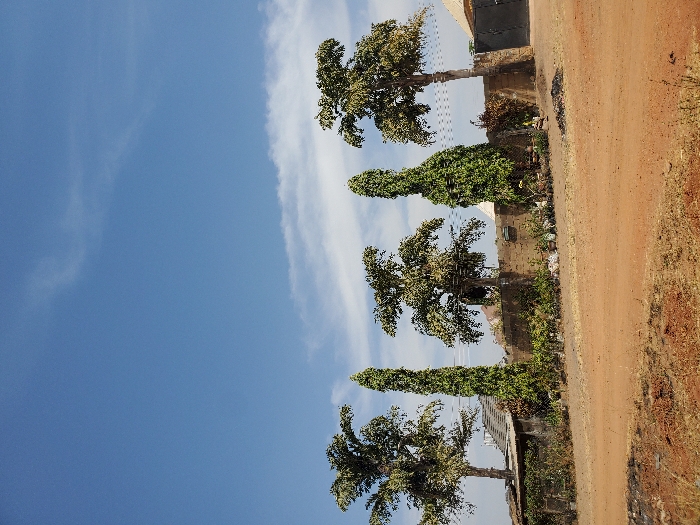 This image depicts an outdoor scene in Bar Jirgi Summa, Nigeria, under a clear blue sky with sparse, high-level cloud cover. The foreground consists of an unpaved reddish-brown dirt road, which appears dry and firm, with minimal dry vegetation along its edges. A small, dark mound, possibly of ash or debris, is present on the right side of the road. The midground features a low-lying concrete block wall, which extends horizontally across the frame, partially obscured by diverse vegetation. Along the wall's base, numerous smaller plants, some appearing to be in pots, are arranged. Five distinct trees are prominent: two tall, slender, columnar evergreen trees flank a central broadleaf tree with a dense canopy. Another broadleaf tree is positioned to the far left, and a fifth broadleaf tree is to the far right. Behind the wall, partial views of structures are visible. On the left, a section of a building with a corrugated metal roof is present. Further to the right, a lighter-colored building facade is discernible. A dark, solid gate, suggesting an entrance to a property, is visible on the far right. A small, indistinct human figure is observed near the base of the right columnar evergreen tree, adjacent to the wall. Above the upper right broadleaf tree, a flock of numerous small, dark avian subjects is visible against the sky.