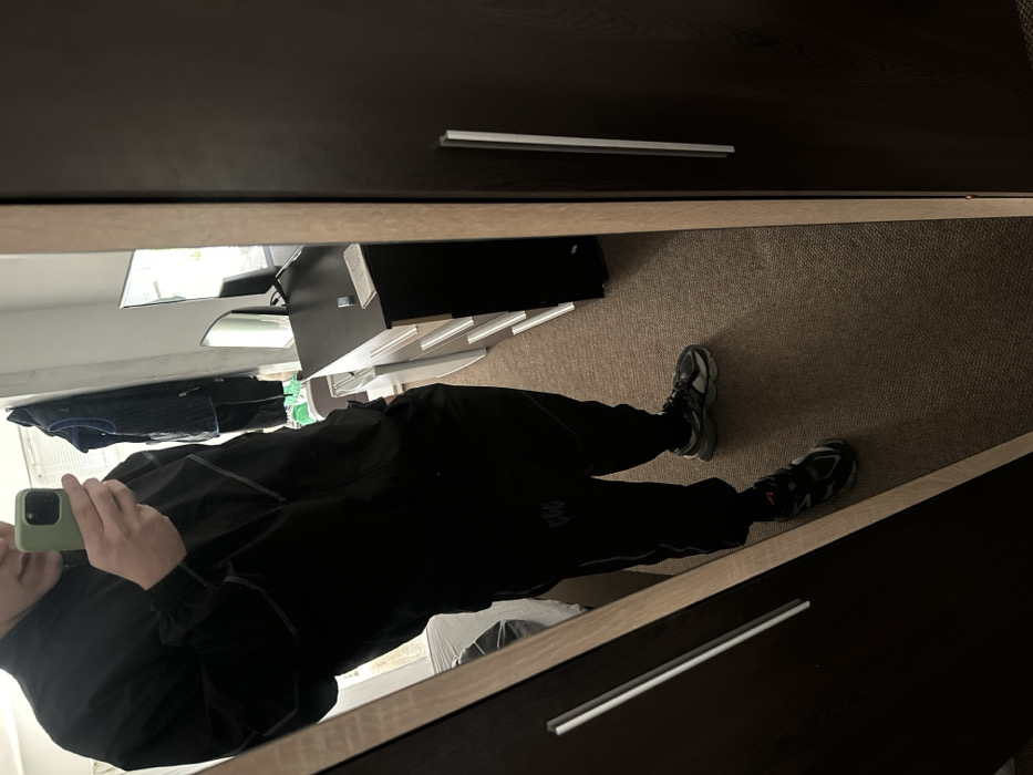 The scene depicts an interior room, located in Bansko, Bulgaria. A single individual, gender indeterminate, is captured in a mirror reflection, positioned centrally in the frame. The individual is taking a photograph with a light green smartphone, held in the right hand, obscuring the face from the nose upwards. The person is wearing a black full-zip jacket featuring light-colored piping or stitching details, and black track pants with a dark, stylized "666" or similar symbol on the upper left thigh. Dark-colored athletic shoes with grey and black elements are visible on both feet. The individual stands on a light brown carpet. The mirror's frame is dark brown with a lighter, possibly wooden, edge on the left, and a dark brown section with two vertical silver handles on the right, indicating a wardrobe or closet door. Reflected in the mirror, behind the individual, is a dresser or chest of drawers with light-colored drawers and a dark top surface. On the dresser top, a dark flat-screen monitor or television is visible, along with a white remote control and a small, shiny metallic object. In the distant background of the reflection, items of clothing, including a dark jacket and a green object, hang from hooks or a rack.