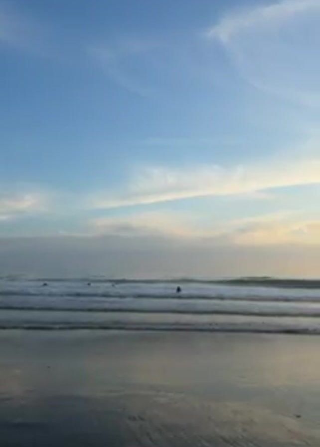 beach scene at sunset. The sky is a mix of blue, white, and orange. There are a few people visible in the water, presumably surfing. The waves are small and gentle. The sand is wet and reflective, mirroring the sky. The sun is setting behind a small hill or cliff covered with trees.
