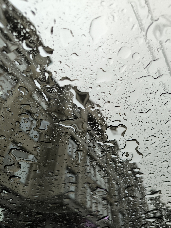 - "The image presents a close-up, upward-angled view through a transparent surface, likely a window or windshield, heavily covered with water droplets of various sizes and shapes" by FM-dWhzM2, licensed under CC BY 4.0