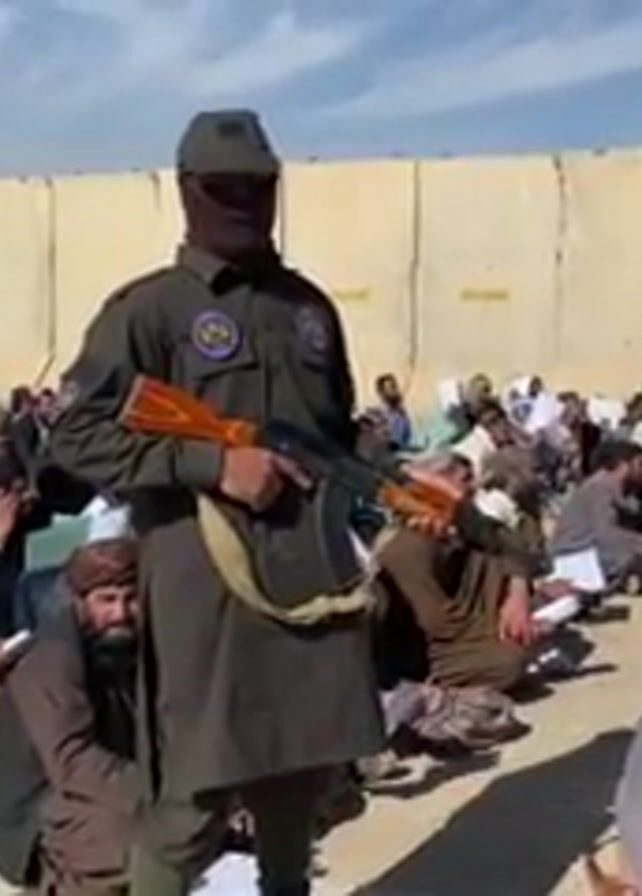 group of men sitting on the ground in rows, many holding papers, against a backdrop of a tall concrete wall. A man in a dark uniform, wearing a face covering and holding an assault rifle, stands guard at the front. Another armed man in a similar uniform stands further back near the wall. The scene is outdoors, with a clear sky overhead. The men sitting on the ground are wearing traditional clothing. The wall has “NO PARKING” written on it.
