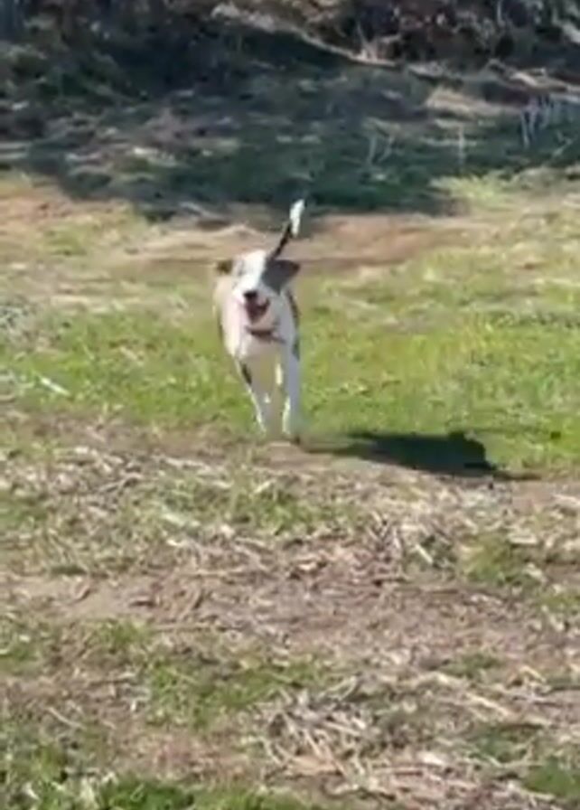 In a sunny outdoor setting, a dog runs towards the camera. The dog is medium-sized, with a gray body, white belly and legs, and dark patches around its eyes. It wears a brown collar. The dog is running across a grassy area with some bare patches, and behind it, there is a sparse forest with tall, thin trees. The dog stops directly in front of the camera, pants, and sniffs the ground.