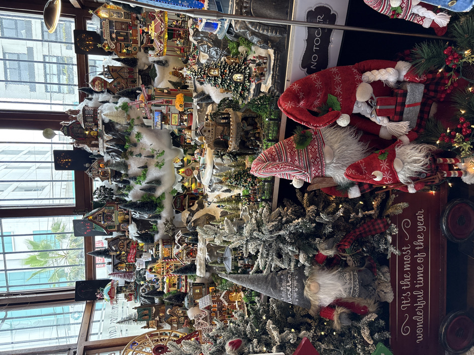 A festive Christmas display features a miniature village scene filled with houses and snowy landscapes