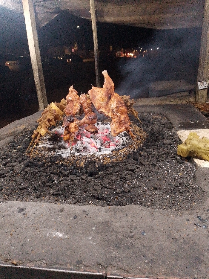 - "Skewered meat and a whole chicken grill over hot coals on a concrete base" by FM-NsHOY2, licensed under CC BY 4.0