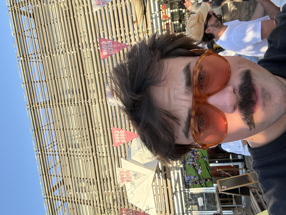 The image features a male individual in the foreground, taking a selfie. He has dark, slightly disheveled hair, a prominent dark mustache, and is wearing large aviator-style sunglasses with tortoise-shell frames and orange-tinted lenses. He wears a dark t-shirt. The right side of his face is illuminated by golden sunlight. The background reveals an outdoor setting at Les Halles de Bacalan in Bordeaux, France. To the left, a large screen behind a glass facade displays a rugby match. Below the screen, a sign is visible with text including "HALLES DE BACALAN". A black A-frame sign stands outdoors. To the right, several other individuals are seated at tables; one male with a tan baseball cap and white t-shirt is partially visible, facing away. Overhead, white awnings or tents, and string lights are present. The upper background showcases the distinctive, slatted architectural facade of the building, composed of numerous horizontal elements. Multiple triangular red and white banners displaying "CUBO ROCK" are strung across the scene. The sky is clear and blue.