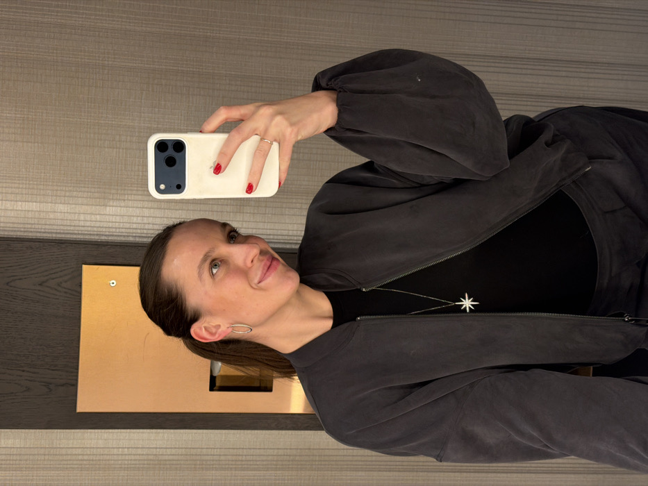 A woman takes a selfie, holding a white iPhone with red nail polish. She wears a black top under a dark gray jacket. A star pendant necklace is visible. Her hair is pulled back, and she has simple oval earrings. The background appears to be a bathroom with light-colored wallpaper and a copper-colored fixture with a cutout.