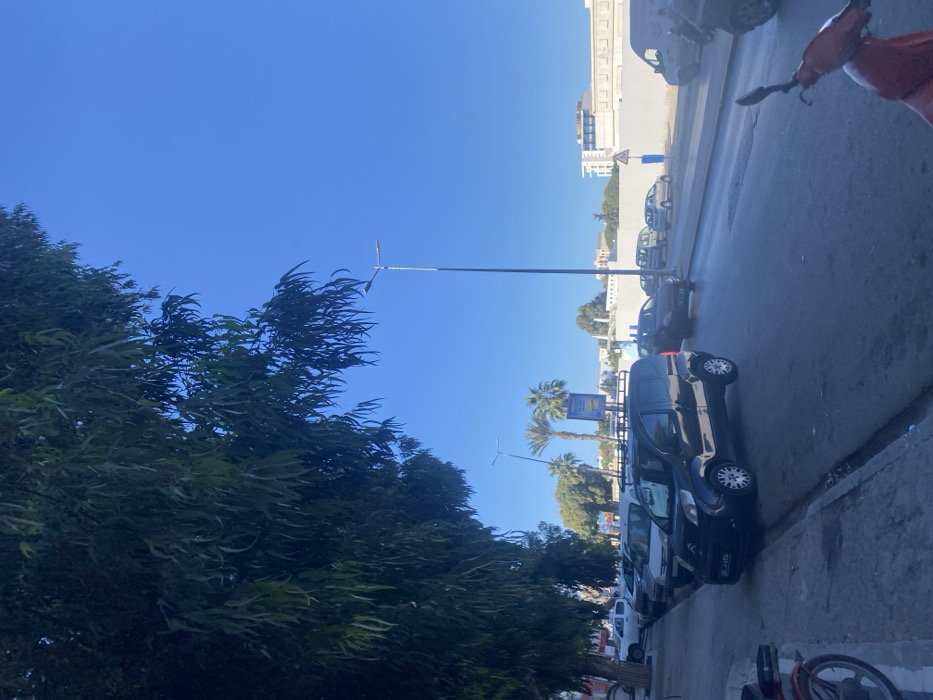 The image depicts an urban street scene in Monastir, Tunisia, on a clear, sunny day. The perspective is low, looking down a street from what appears to be a sidewalk. In the immediate foreground on the left, dense, dark green foliage from a large tree with elongated leaves partially obscures the upper left portion of the frame. Part of a red scooter or moped is visible at the bottom left, showing a wheel and a segment of its body on the concrete sidewalk. At the bottom right, the front section of another red scooter or moped, including the handlebars and headlight, is present. The midground features a dark asphalt road, which appears wet in several patches, stretching into the distance. On the left side of the road, parallel to a concrete curb, multiple vehicles are parked. A prominent dark grey minivan with a roof rack and a visible Tunisian license plate (e.g., "285 4556") is parked closest to the viewer. Behind it, several other cars, including a white sedan and a white pickup truck, are parked along the sidewalk. Farther down the street on the left, several palm trees are visible, with a blue square sign featuring a yellow graphic situated between them. On the right side of the road, a tall, slender streetlight pole with a modern LED fixture stands centrally. Further down the road, additional cars are present, with a dark van partially visible in motion or parked on the far right. A red triangular warning sign is positioned on the right, adjacent to a low, white wall that extends across the background. The background primarily consists of white and light-colored buildings under a clear, bright blue sky with no clouds. A long, flat-roofed white building is prominent on the right, with a more modern, multi-story building featuring darker windows located behind it to the left. The scene is illuminated by strong, direct sunlight, suggesting a time between late morning and early afternoon. No individuals are clearly discernible in the image.