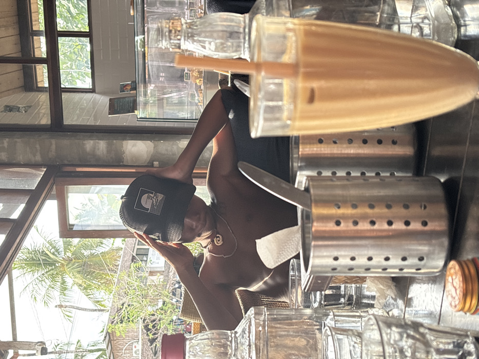 An individual is seated indoors at a cafe or restaurant in General Luna, Philippines, viewed from the chest up. The person, appearing male and shirtless, wears a dark mesh-back trucker hat with a white graphic depicting a sun, horizon, and waves. A silver chain with a light-colored, possibly shell, pendant is around their neck. Both hands are raised, resting on the sides of the hat, with fingers curved over the brim, obscuring the face as the head is tilted down. The individual is seated at a dark-colored table. In the foreground, a tall glass of iced, light brown beverage with a straw is present on the right, alongside a clear glass bottle. Two perforated stainless steel utensil holders are in the center, one containing cutlery and a white paper napkin. To the left, a clear bottle with a red cap and other clear drinking glasses are visible, along with a stack of copper-colored circular objects on the table. The background reveals a brightly lit interior with concrete structural elements and dark wooden window frames. Through the large windows, a sunny, tropical outdoor scene is visible, featuring lush green foliage, prominent palm trees, and part of a building with a natural-style roof and a distant sign, consistent with a setting in General Luna. A glass display case with items is visible inside the cafe on the right.