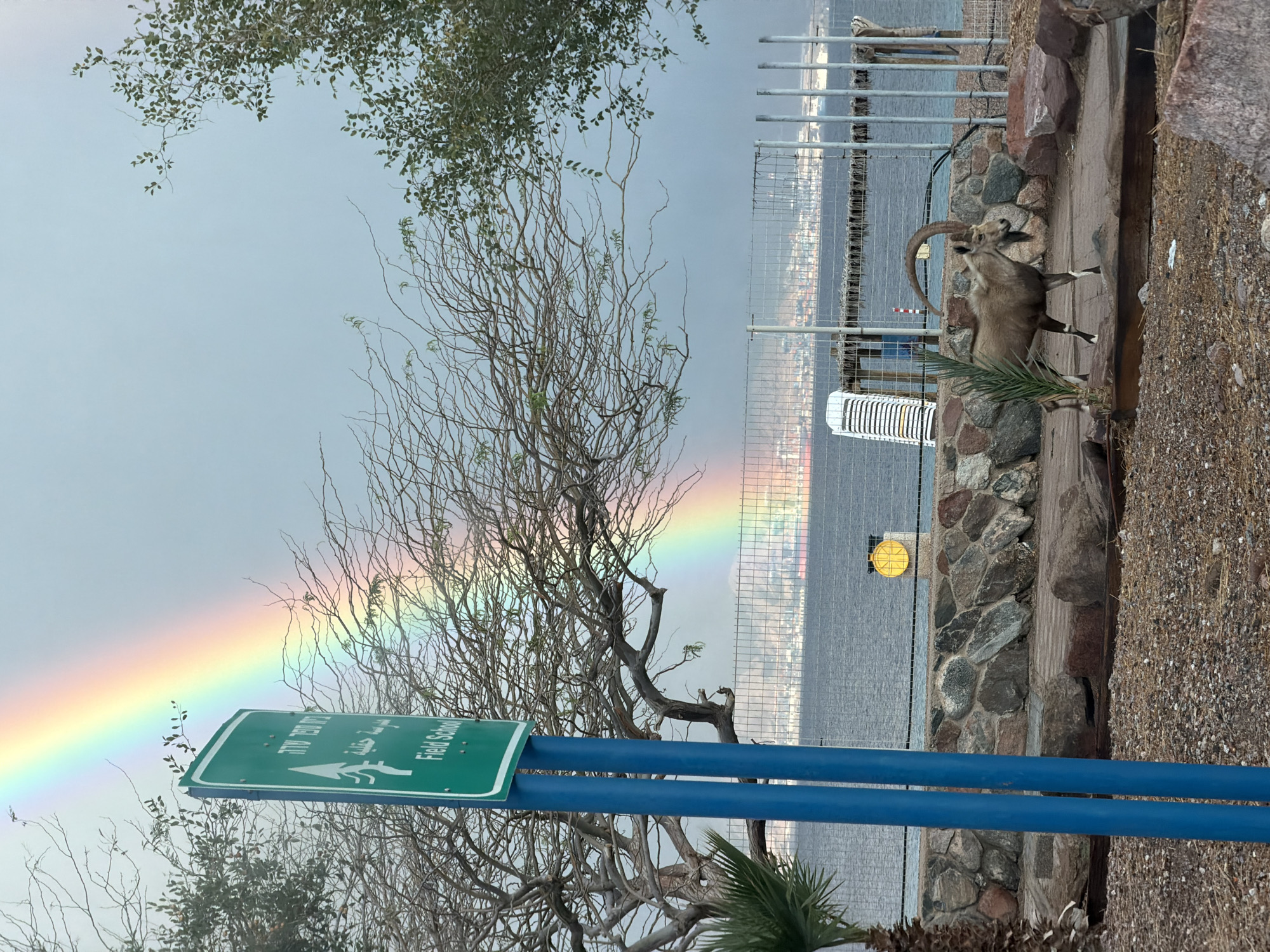 The image displays an outdoor scene in Eilat, Israel, featuring an adult male Nubian ibex under a prominent rainbow. In the left foreground, a green rectangular sign mounted on two blue vertical posts displays "Field School" in English and Hebrew (בית ספר שדה), accompanied by an upward-pointing white arrow. To the left of the sign, the fronds of a palm tree are partially visible. A large deciduous tree with intricate, mostly bare branches dominates the mid-ground, extending across the frame behind the sign. Another tree with green foliage is partially visible on the right side. An adult male Nubian ibex, characterized by light brown fur, a dark face and beard, and substantial curved horns, stands on a mixed dirt and paved pathway in the lower mid-ground. The ibex faces right, with its front left leg slightly lifted, indicating motion. Behind the pathway, a low wall constructed from varied rocks supports a metal chain-link fence. Beyond this fence, the waters of the Gulf of Aqaba (Red Sea) stretch across the background. A distant city skyline and mountains are visible on the opposite shore under a hazy sky. Stacked white plastic lounge chairs are placed against the fence to the left, and a yellow circular object on a white post is positioned near the water's edge to the right. The sky is predominantly overcast and grey, with a vivid, multi-colored rainbow arc spanning from the upper left corner diagonally across the frame. The ground in the immediate foreground consists of dark gravel and scattered rocks. No human subjects are present in the image.