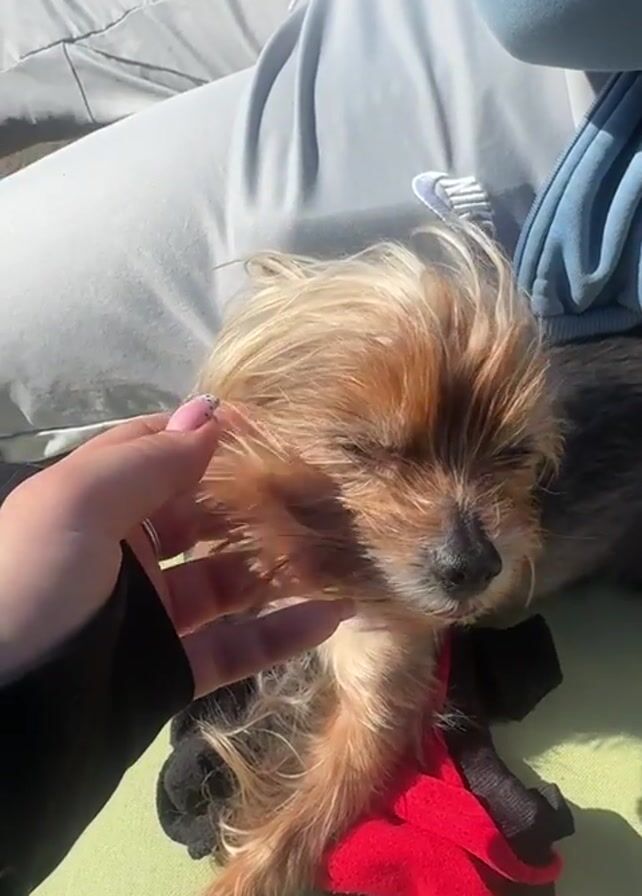 small, light-brown Yorkshire Terrier dog lying on a light-green surface, possibly a beach chair, being gently petted by a person