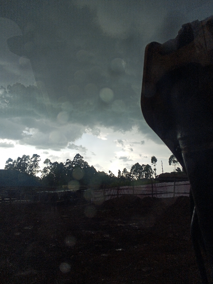 The image depicts an outdoor scene in Borabu Chitago ward, Kenya, under a heavily overcast sky dominated by dark grey clouds, with a brighter, less dense cloud formation visible towards the horizon. Multiple circular light blurs, consistent with raindrops on a viewing surface, are present across the frame. In the immediate foreground on the right, a large, dark, out-of-focus, curved object, possibly a component of a vehicle or a structural element, partially obscures the view. The ground in the lower mid-foreground is dark, appearing wet, muddy, or recently disturbed earth. The midground features a prominent silhouette of a dense line of tall, slender trees against the sky. To the left of the frame, a dark-roofed building is discernible beneath the treeline. Further right, a fence constructed from corrugated metal sheets is visible, behind which are several mounds of dark material, possibly soil or debris. No individuals, animals, or explicit actions are present within the scene.