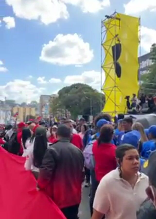 crowd of people holding a large Venezuelan flag. The flag is red, yellow, and blue. The people are marching down a street with buildings on either side. Some people are wearing blue hats. There is a large yellow structure in the background. Some people in the crowd are wearing red shirts and others are wearing white shirts. A tall building is visible in the distance with a sign that reads "Free Maduro and Cilia."