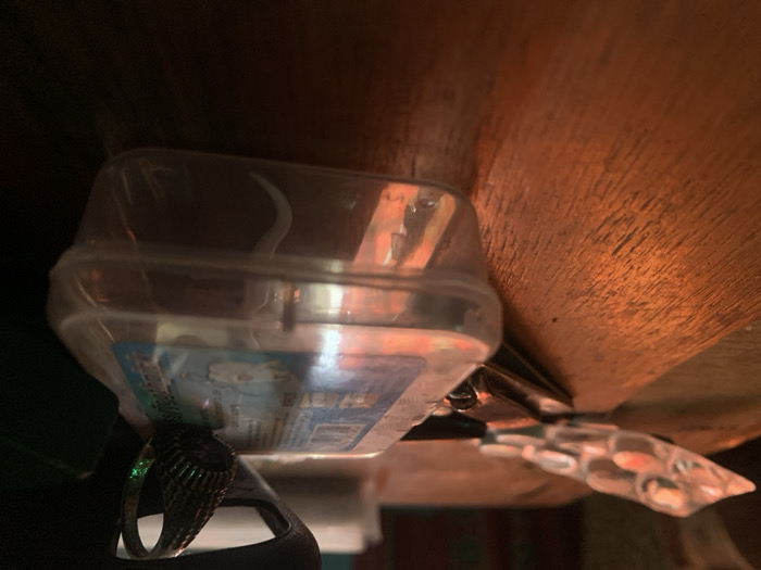 The scene, located in the city of Jos, Nigeria, captures a close-up, static arrangement of objects on a reddish-brown wooden surface. Warm, low-level illumination casts orange-red reflections across the surface and objects. In the foreground, a clear, rectangular plastic container features a blue and white label on its lid, displaying text and a cartoon graphic. Inside the container, a white, curved object, consistent with a dental floss pick, is visible. Resting on the container's lid is an ornate, dark metal ring with a textured band and a central dark element. To the left, a silver-toned nail clipper is positioned, partially closed. Further left, a clear plastic blister pack, designed with multiple individual compartments, lies on the wood, with some compartments appearing empty or holding indistinct remnants. No people are present in the image.