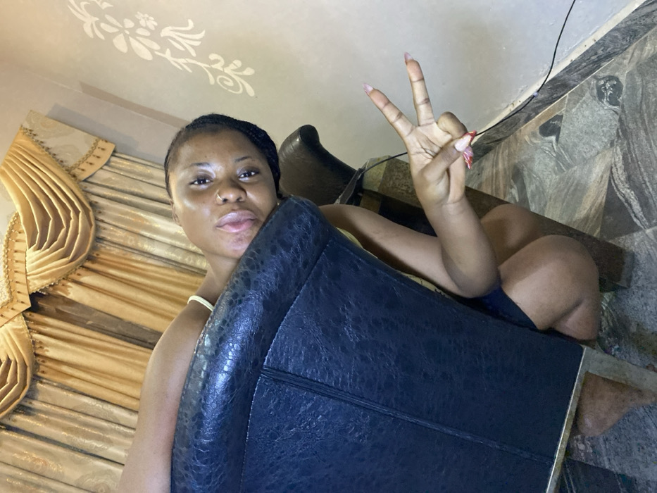 A dark-skinned woman poses in front of a room's corner. She holds up her hand with a "peace" sign. She sits on a chair with dark upholstery, revealing shorts. Behind her is a wall with molding and a curtain with gold accents. The floor is tiled in a grey marble pattern. A thin black wire runs down the wall. A decorative floral pattern is visible on the ceiling.
