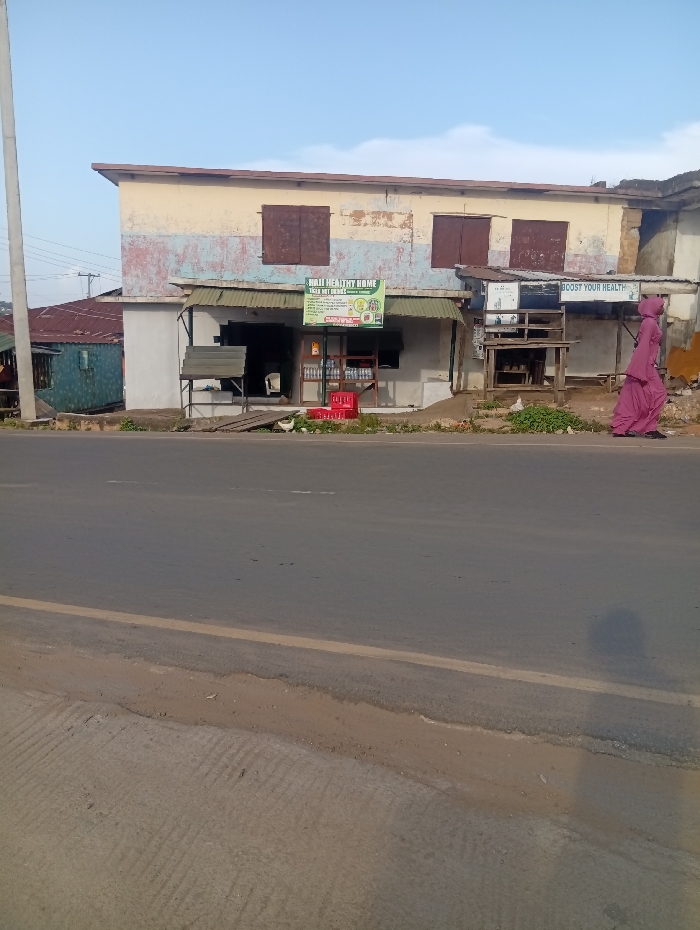 The image depicts a two-story building situated alongside a paved road in Okengwe - Obehira, Nigeria, under a clear sky