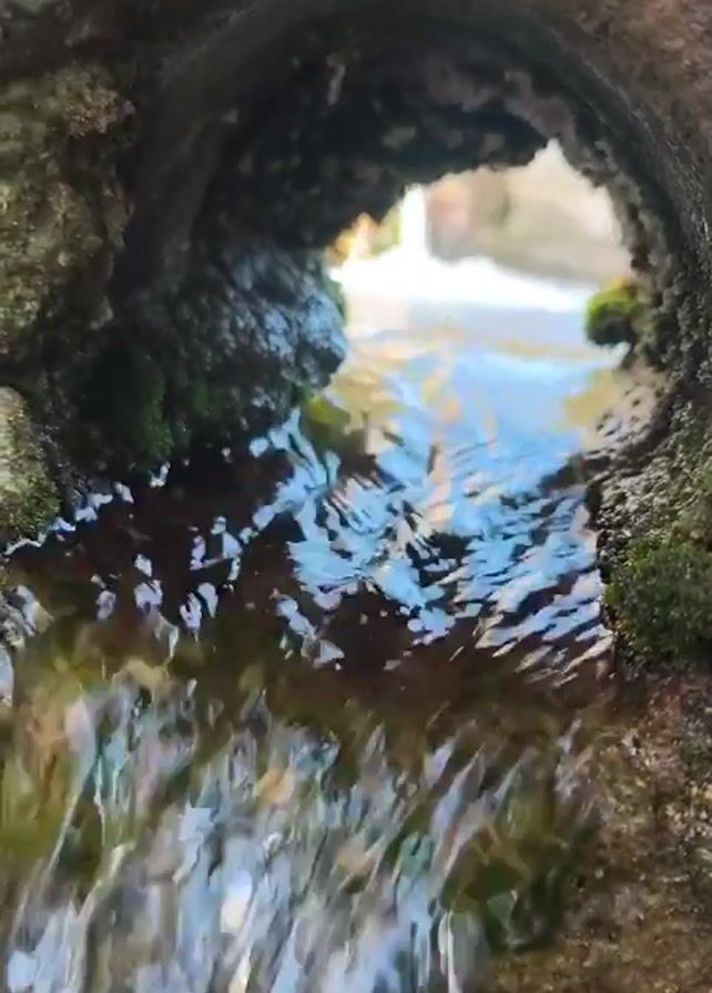 close-up view of water flowing through a small, moss-covered stone archway. The water is clear and reflects the sky, creating a shimmering effect. The archway is rough and textured, with moss growing on its surface. In the background, there is a blurred outdoor scene with trees and bright light.