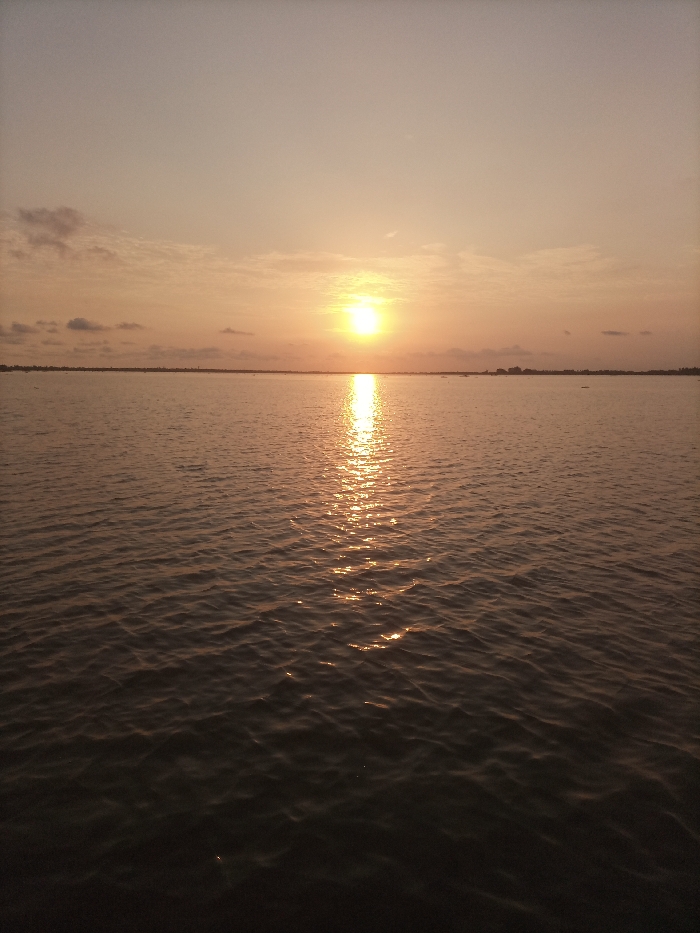 The image displays a sunset over a wide body of water, located in the city of Unknown, Unknown. The sun, a bright golden orb, is positioned slightly left of the image's vertical center, near the horizon line. It casts a prominent, shimmering golden-orange reflection path across the water, extending towards the foreground. The sky, occupying approximately the upper two-thirds of the frame, transitions from light orange and peach hues near the horizon to a lighter, more muted tone higher up, with scattered wispy clouds. The water surface is dark, exhibiting numerous small, irregular ripples that catch the sun's light in the reflection path. A thin, dark landmass or vegetation line is visible along the distant horizon. On the right side of the horizon, a cluster of indistinct dark structures, resembling distant buildings, is present. Several tiny, dark, unidentifiable objects are visible on the water surface in the mid-distance. There are no individuals or identifiable large objects in the foreground or mid-ground.