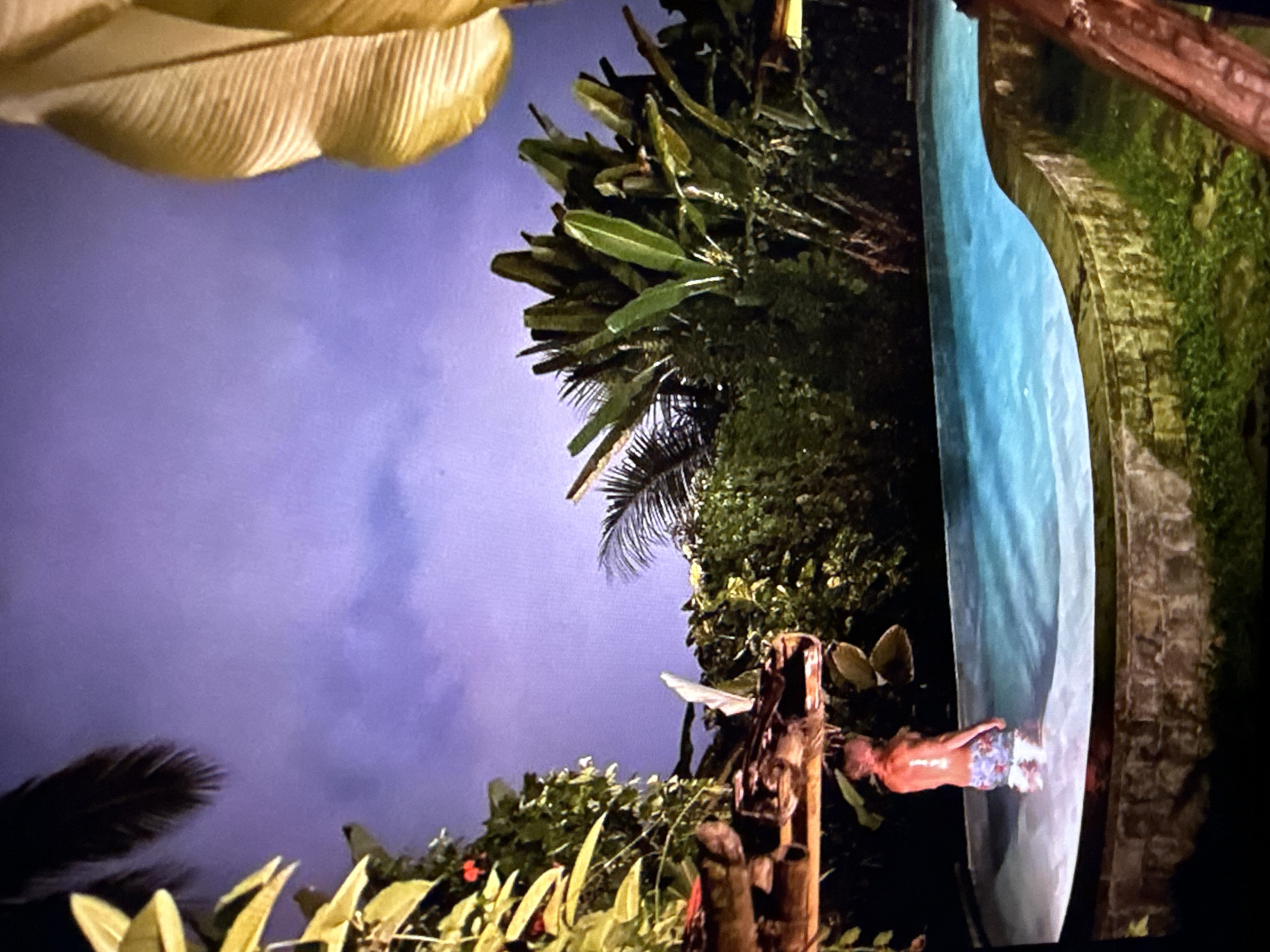 A slightly rotated, medium shot shows a person in a pool at night in North Kuta, Indonesia. The subject, wearing patterned swim trunks, is partially submerged in a blue pool located adjacent to lush, green vegetation. The pool's edge is lined with stone and greenery. The background features a twilight sky, with more green foliage and palm fronds visible. In the foreground, parts of a yellow leaf and some bamboo structures are visible.