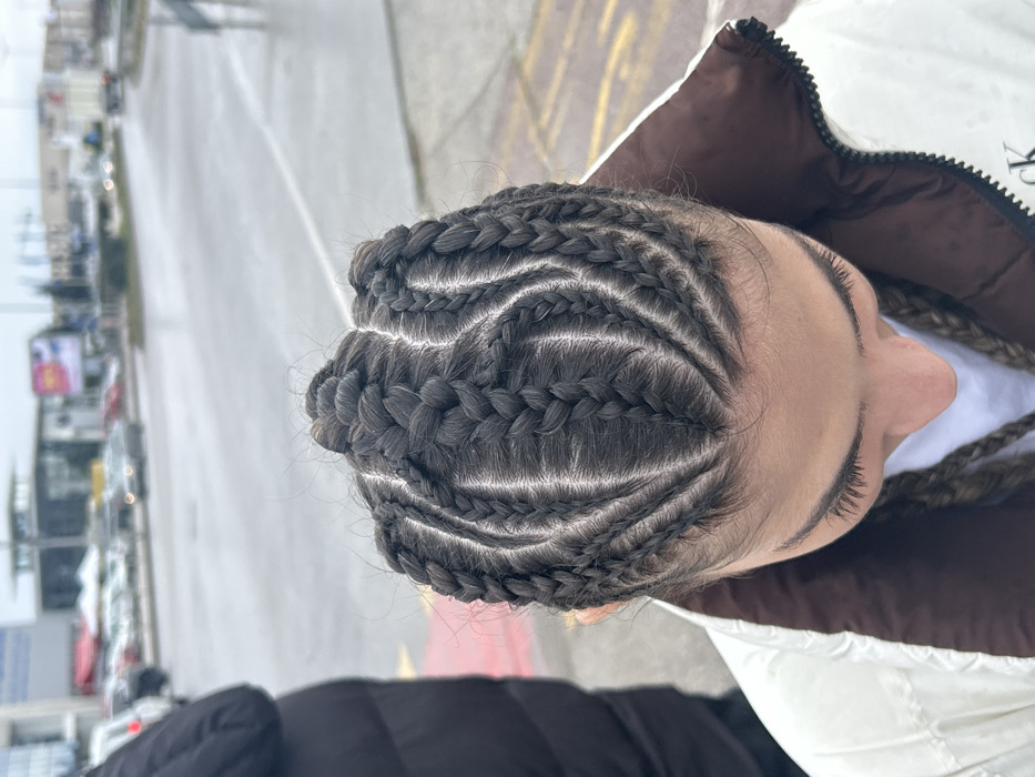 - "The image depicts an overhead perspective of a person with dark brown hair styled into multiple cornrow braids, creating intricate geometric patterns across the scalp with a prominent central crest braid" by FM-PXegS2, licensed under CC BY 4.0