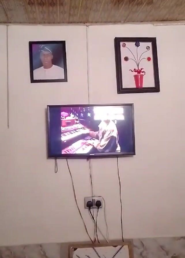 The camera shows an indoor wall with a mounted television playing a video of a person singing on a stage