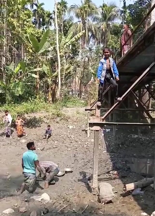A child in a blue jacket jumps from a platform structure into a muddy pit below. Two adults are in the mud pit working. Other children and an adult are standing nearby. The setting appears to be a rural area with trees and vegetation. The weather is sunny.