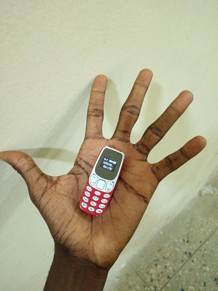 An open human hand with dark skin is displayed against a neutral wall, palm up. Resting in the center of the palm is a miniature red and gray mobile phone. The phone's screen displays signal strength and carrier information, including "MTN NL" and "Glo LTE." The fingers are spread wide, with visible wrinkles and veins on the skin. The background wall is a light tan color.